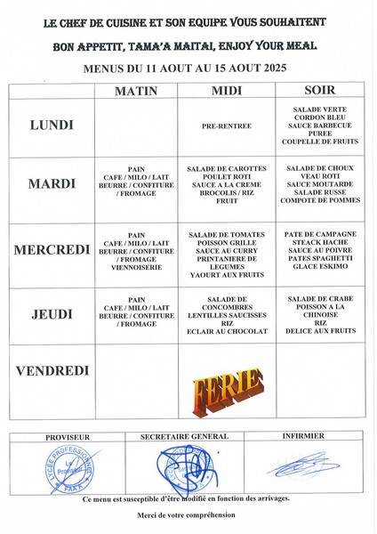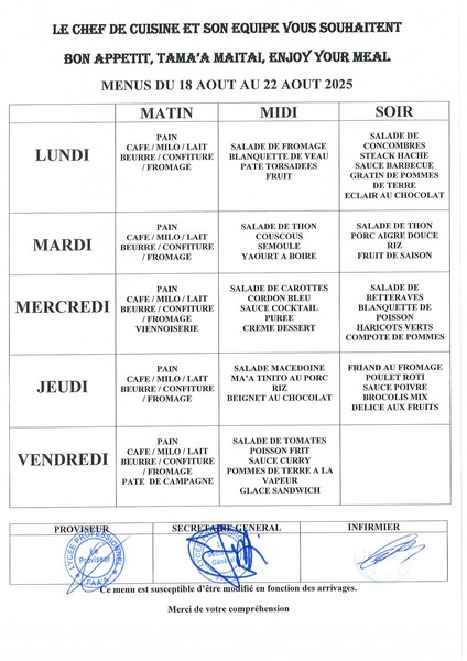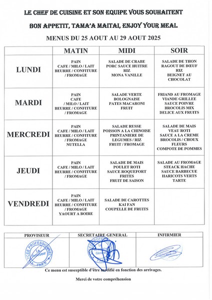 Menus du 12 août au 12 septembre 2025 2025-08-12 par Administrateur Menus du 12 aout au 14 aoutMenus du 18 aout au 22 aoutMenus du 25 aout au 29 aoutMenus du 1er septembre au 5 septembreMenus du 8 septembre au 12 septembre