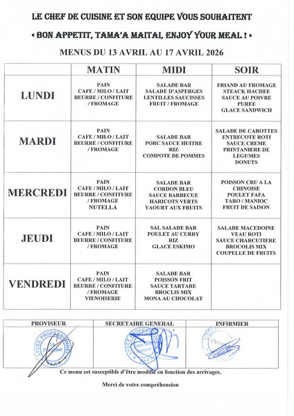 Menus du 13 au 17 avril