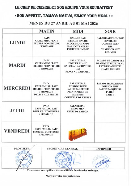 Menus du 27 avril au 1er mai