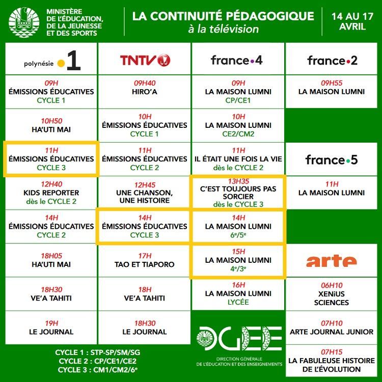 Des émissions à la télé pour apprendre (semaine 2) 2020-04-13 par Administrateur Voici le programme des différentes chaînes accessibles au fenua du 14 au 17 avril.