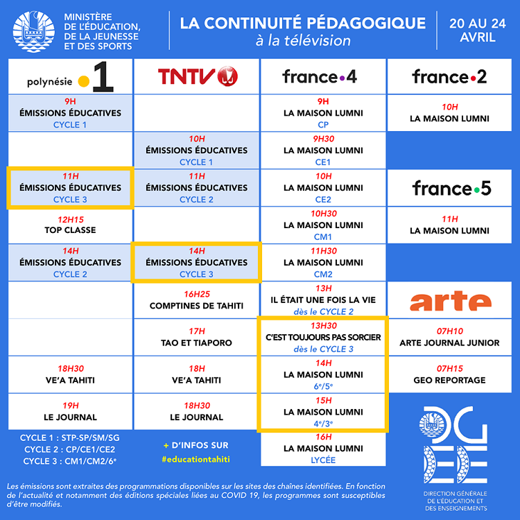 Des émissions à la télé pour apprendre (semaine 3) 2020-04-18 par Administrateur Voici le programme des différentes chaînes accessibles au fenua du 20 au 24 avril.