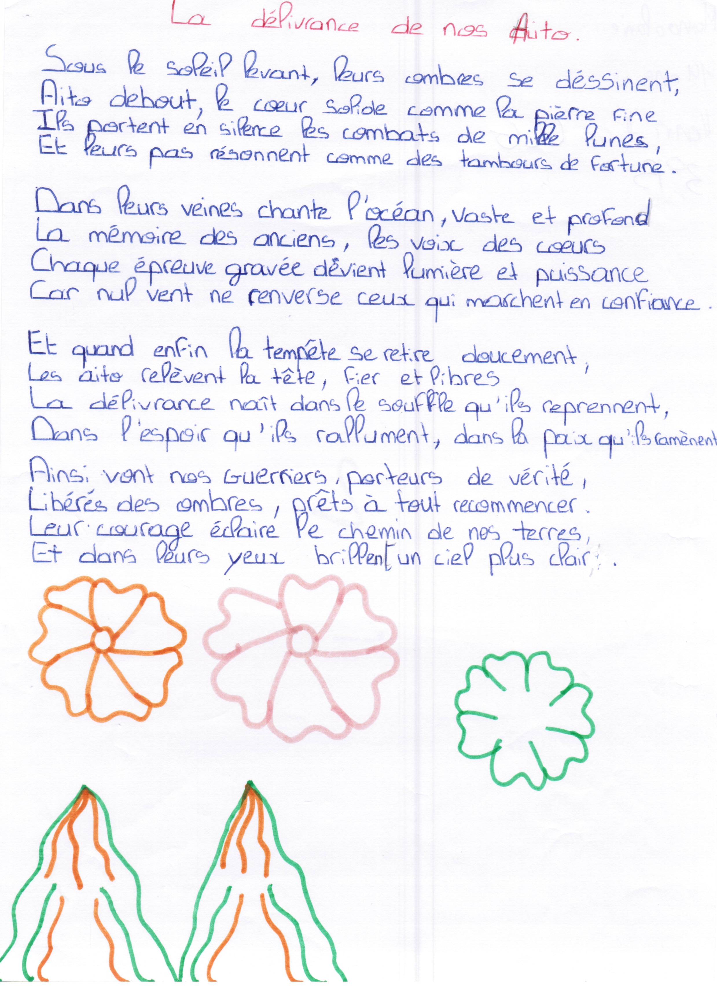 Le 2ème prix de dessin et le 2ème prix de poème ont été remportés par la Classe de défense et de sécurité globale du collège de Faa'a, respectivement par Sheylsia et Manoalanie.