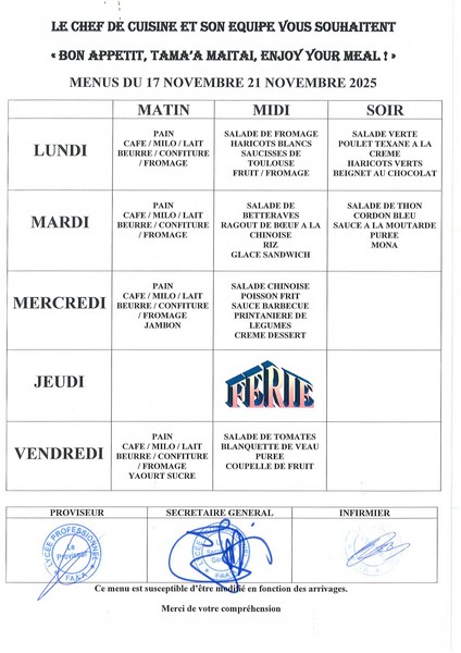 7h00 à 12h30 Mercredi - 7h00 à 13h15 Vendredi